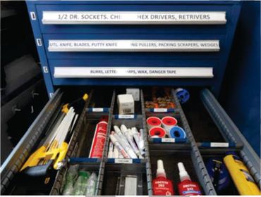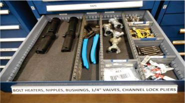 All of our tooling is labeled, inventoried and organized in a manner that facilitates availability and improves the efficiency of our work force. Our tooling includes all the necessary safety equipment and expendables to execute in a manner that meets or exceeds all requirements.